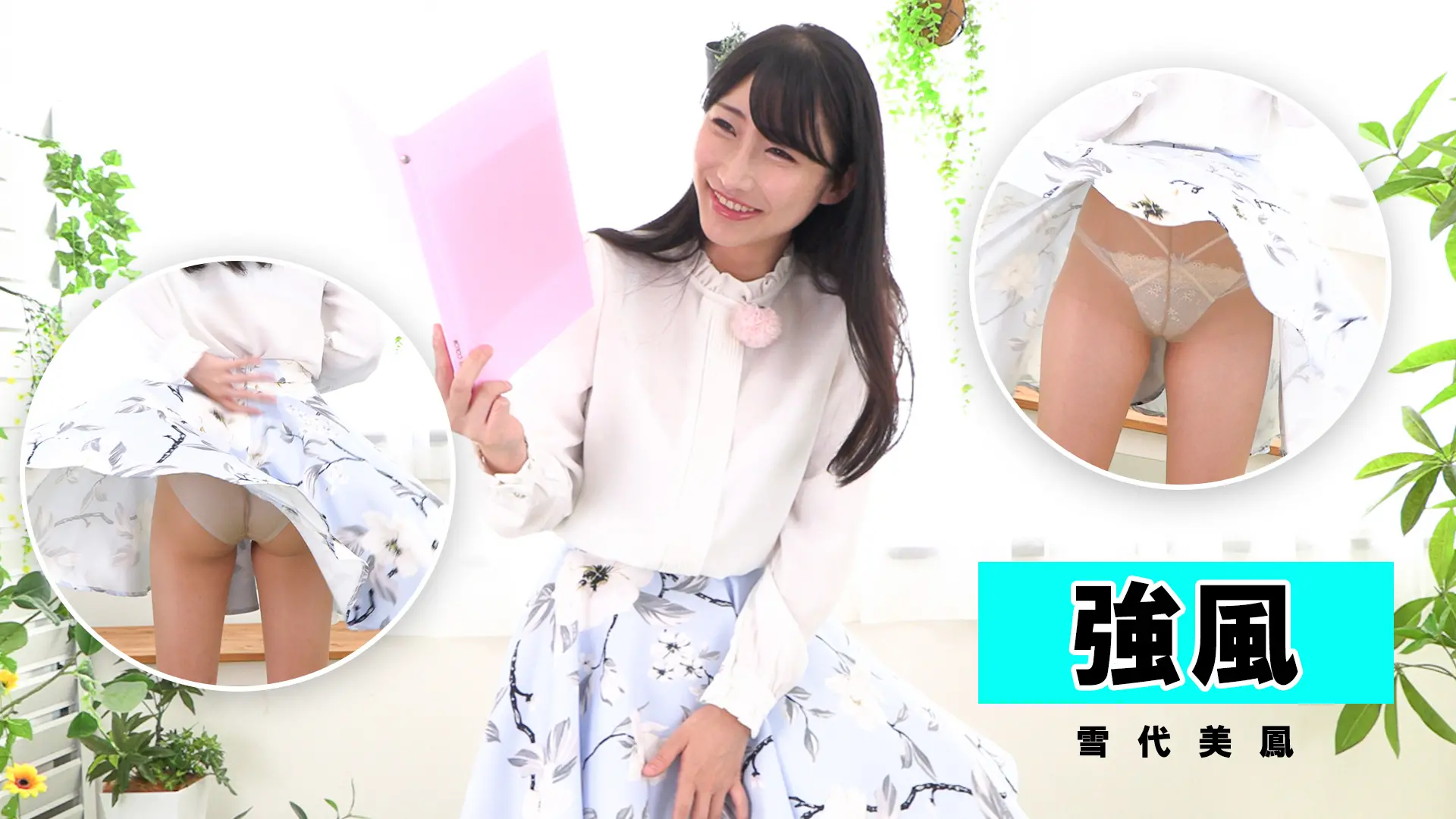 | お天気放送の撮影中。真面目に撮影に挑む美鳳さんに強風が襲い掛かる! あまりに強い風にスカートがひらり!パンツが見えちゃう! 何度抑えてもめくれてしまうスカートに先ほどまで真面目に撮影に挑んでいた美鳳さんも 笑って誤魔化すしかなくて・・・ |