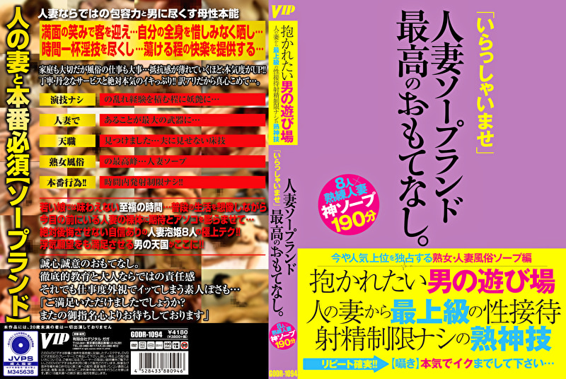 抱かれたい男の遊び場・・・人の妻から最上級の性接待・・・射精制限ナシの熟神技!!満面の笑みで客を迎え・・・自分の全身を惜しみなく晒し・・・時間一杯淫技を尽くし・・・蕩ける程の快楽を提供する・・・。人妻ならではの包容力と男に尽くす母性本能!!!!訳アリだから真心こめて・・・「私が本気でイクまでして下さい・・・」 / 「いらっしゃいませ」人妻ソープランド最高のおもてなし。