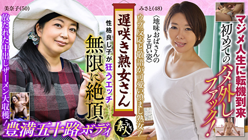 1人目熟女さん、遊びのSEXとかしたことが無いような、真面目に生きていた感じが伝わってくる地味系熟女さんです。熟女らしくも、使用頻度の低そうな綺麗な乳首が素敵です。身体を弄られた際の反応にも、ウブ熟女なテイストが溢れています。若いチンポでガン突きされて、堪えきれずに漏れ出る喘ぎ声、一心不乱に快感に没入し、リアルで生々しい痴態を堪能させてくれます。耳に心地良い喘ぎ声も素敵です。2人目熟女さん、人の良さそうな農家のおばちゃんです。まんまと家に上がりこむと、マッサージのていで身体を弄られ、困惑しまくりながらも、久しぶりの快感に浸っていきます。クンニの快感に抵抗もままならずリアルに絶頂。立派なイチモツを前に、思わずやる気を出してフェラ、一気呵成に挿入され、ガン突きされて快感に没入、見事なイキッぷりを披露、最後は幸せそうに中出しを受け止めます。 / 遅咲き熟女さん 見たくないですか? 地味なおばさんのどエロい姿 23